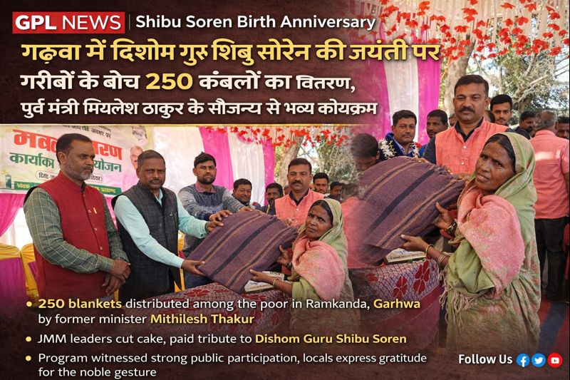 Shibu Soren Birth Anniversary: गढ़वा में दिशोम गुरु शिबू सोरेन की जयंती पर गरीबों के बीच 250 कंबलों का वितरण, पूर्व मंत्री मिथलेश ठाकुर के सौजन्य से भव्य कार्यक्रम January 11, 2026